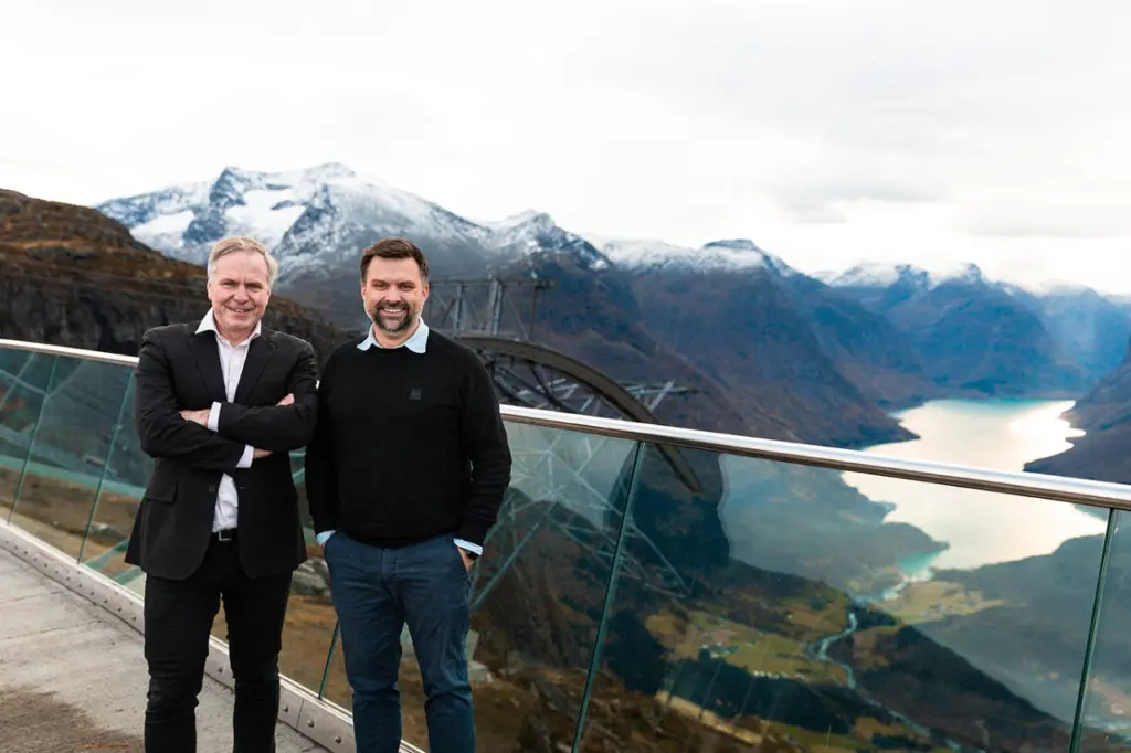 – Drivkraft ønsker å få ting til å skje – ta risiko, kople folk og bygge nytt næringsliv slik vestlendingen kan det: med vilje, handlekraft og tru på folk, seier styreleiar Bjørn Aage Haugen (t.h.) Her på toppen av Loen Skylift saman med den påtroppande daglege leiaren. Foto: Dag Ulvedal
